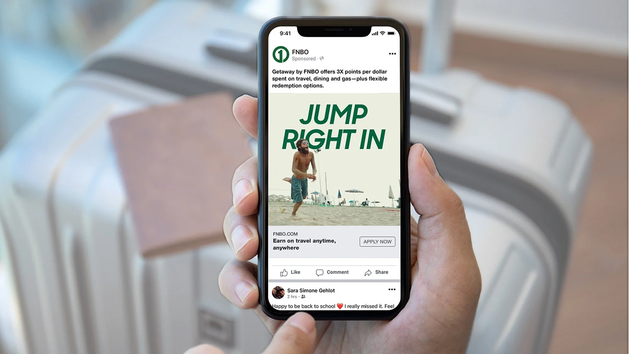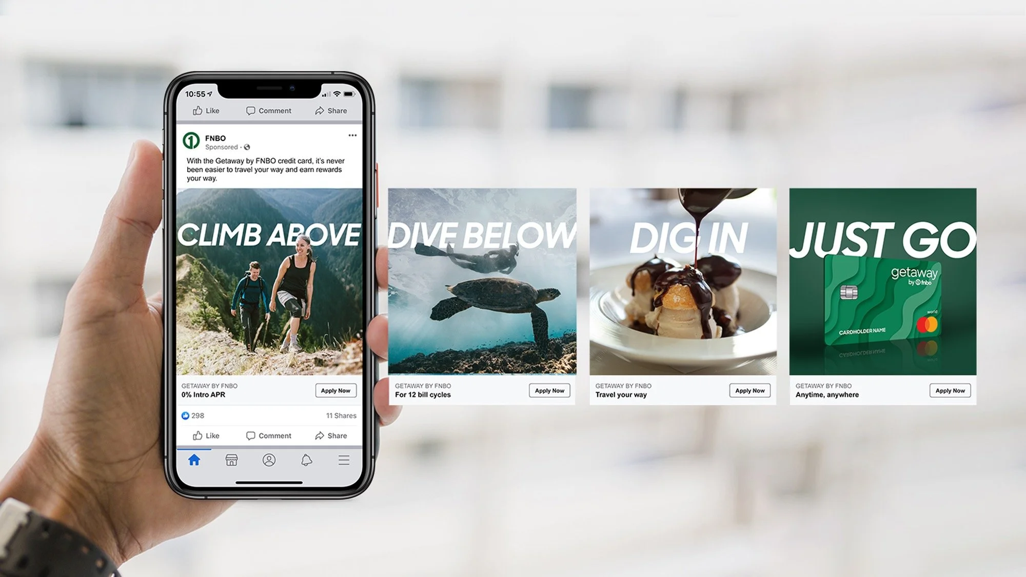 Our team created a visually engaging credit card design inspired by topographical maps, leaning heavily into FNBO's brand colors. We then created an entire launch campaign, featuring social, digital, direct mail, email, and a landing page—each of which is designed to capture the energy and enthusiasm of travel, both near and far.