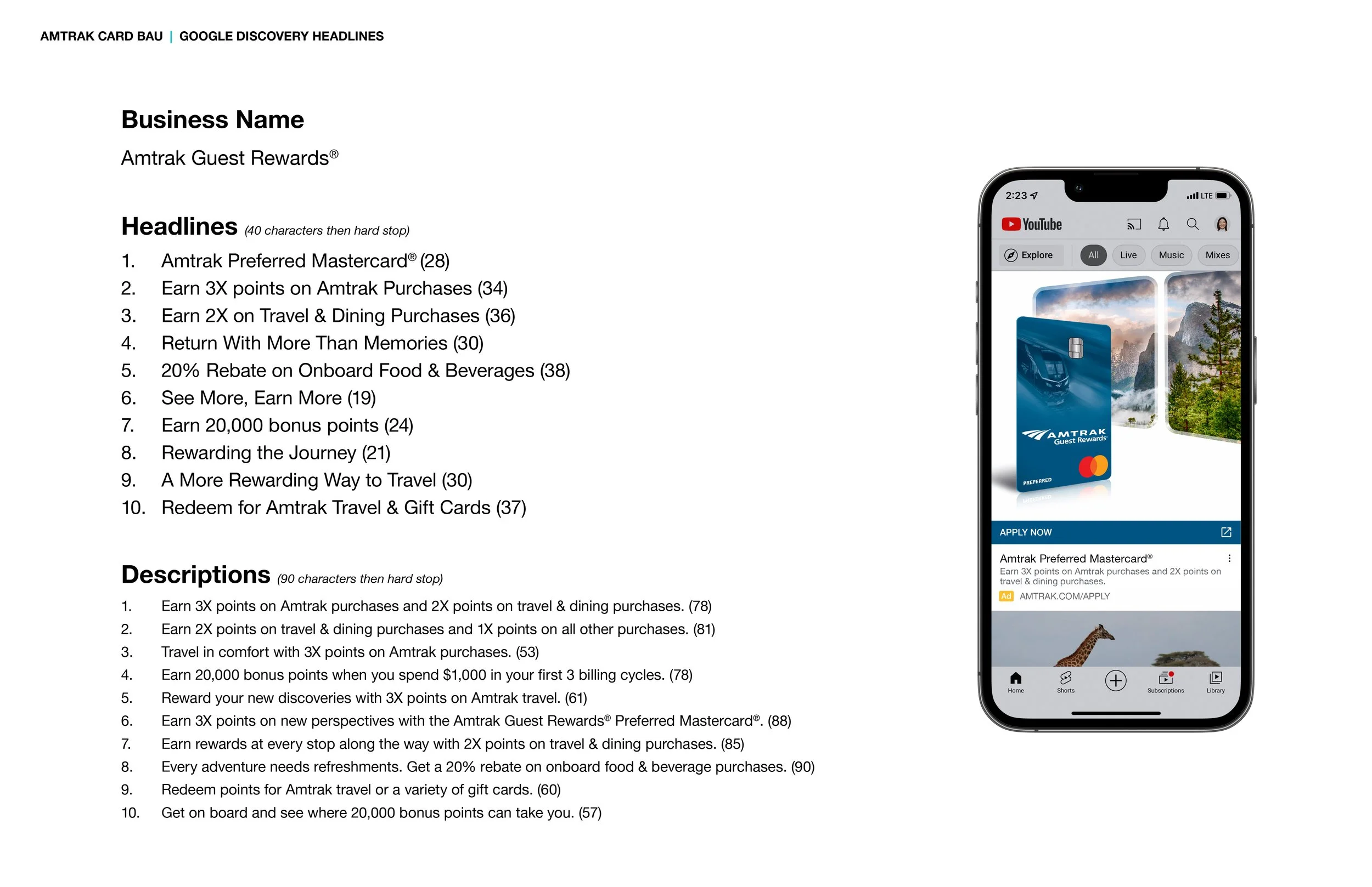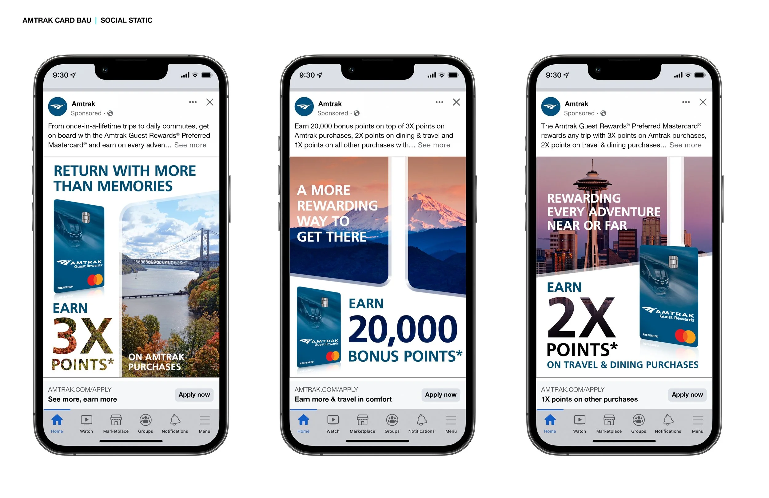 To generate interest in the Amtrak Guest Rewards® Preferred Mastercard®, FNBO is running BAU creative after the LTO offer ends in April, and we need to create assets to promote it across display, social media, and paid search.